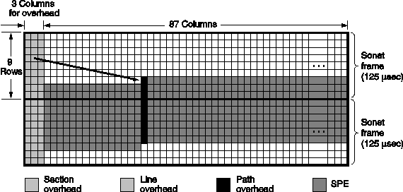The remaining 87 columns hold 50.112 Mbps of user data. However, the user data, called the Synchronous Payload Envelope - SPE - do not always begin in row 1, column 4. They can begin anywhere within the frame. A pointer to the first byte is contained in the first row of the line overhead. The first column of the SPE is the path overhead (i.e., header for the end-to-end path sublayer protocol).
