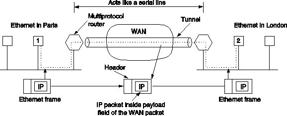 Fig. 5-38. Tunneling a packet from Paris to London.