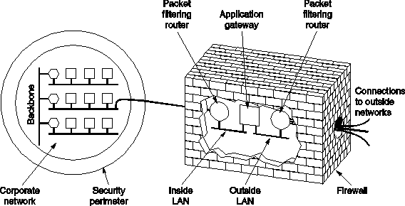 Firewall is an electronic drawbridge, all traffic to or from a company's LAN is forced to go through (Fig. 5-43). The firewall in this configuration has two components: two routers that do packet filtering and an application gateway. Simpler configurations also exists, but the advantage of this design is that every packet must transit two filters and an application gateway to go in or out.