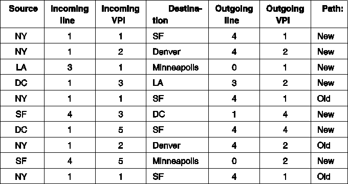 The tables corresponding to the routes of Fig. 5-67 are shown in Fig. 5-68. For example, the first call generates the (4,1) entry for VPI 1in the DC table because it refers to cells coming in on line 1 with VPI 1 and going to SF. However, an entry is also made in the Denver table for VPI 1 showing that cells coming in from Denver with VPI 1 should go out on line 1with VPI 1. These are cells traveling the other way (from SF to NY) on this virtual path. Note that in some cases two or three virtual circuits are sharing a common path. No new table entries are needed for additional virtual circuits connecting a source and destination that already have a path assigned.