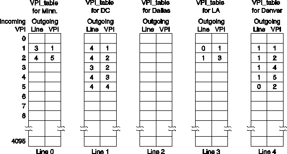 Let us now see how cells could be routed within an interior switch (one that is attached only to other switches and not to hosts). Let us consider a concrete example, the Omaha switch in Fig. 5-66. For each of its five incoming lines, it has a table, vpi_table, indexed by incoming VPI that tells which of five outgoing lines to use and what VPI to put in outgoing cells. Let us assume the five lines are numbered from 0 to 4, as in the figure. For each outgoing line, the switch maintains a bit map telling which VPIs are currently in use on that line.