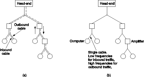 Fig. 2-4. Broadband networks. (a) Dual cable. (b) Single cable.