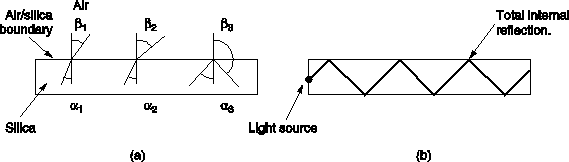 Fig. 2-5. (a) Three examples of a light ray from inside a silica fiber