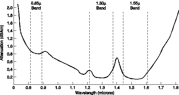Wavelength 0.85, 1.30, and 1.55 microns (micro meters) are used for communication (Fig. 2-6). 0.85 has higher attenuation but it has a nice property that, at that wavelength, the lasers and electronics can be made from the same material. The bands for all three wavelengths are 25000 - 30000 GHz.