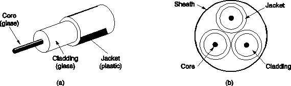 Fiber optics cables are similar to coax, except without the braid (Fig. 2-7). In multimode fibers, the core is typically 50 microns in diameter, in single mode fibers the core is 8 - 10 microns. The cladding has a lower index of refraction than the core to keep all the light in the core.