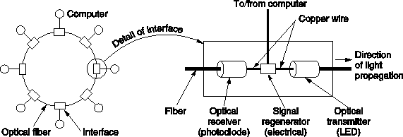 Fiber optics can be used for LANs as well as for long-haul transmission. Tapping onto it is more complex than connecting to a copper wire. One way around the problem is shown in Fig. 2-9.