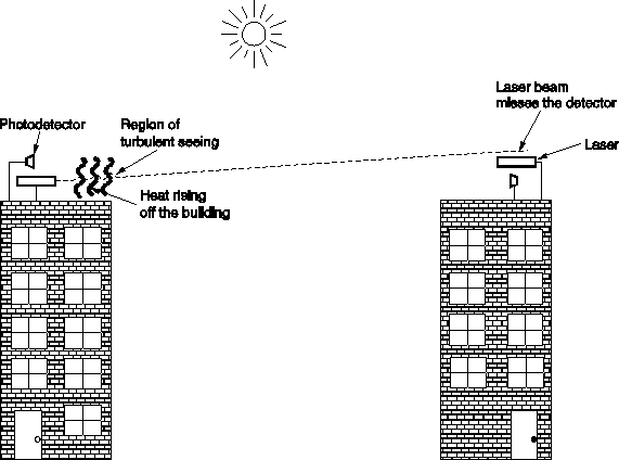 A disadvantage is that laser beams cannot penetrate rain or thick fog. Some other phenomena in the atmosphere can also influence the communication using laser (Fig. 2-13.).