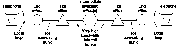 At present, the telephone system can be, with some simplifications, described as follows: Each telephone has two copper wires coming out of it that go directly to the telephone company's nearest end office (in the US there are about 19000 end offices). The two wire connection of the telephone and end office is called local loop.