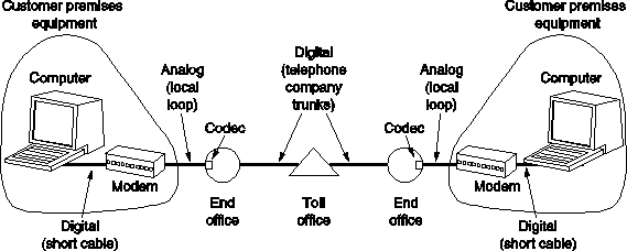 The local loops are sill analog. Consequently, when a computer wishes to send digital data over a dial-up line, the data must first be converted to analog form by a modem for transmission over a local loop, then converted to digital form for transmission over the long-haul trunks, then back to analog over the local loop at the receiving end, and finally back to digital by another modem for storage in the destination computer (Fig. 2-17.).