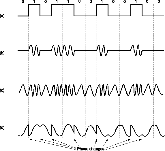 To get around the problem, especially on telephone lines, analog (AC) signaling is used. It is based on continuous tone in the 1000 to 2000 Hz range, called sine wave carrier, with amplitude, frequency or phase modulation to transmit information (Fig. 2-18.).