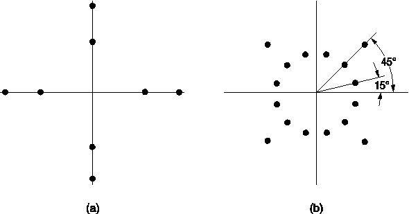 Fig. 2-19. (a) 3 bits/baud modulation. (b) 4 bits/baud modulation.