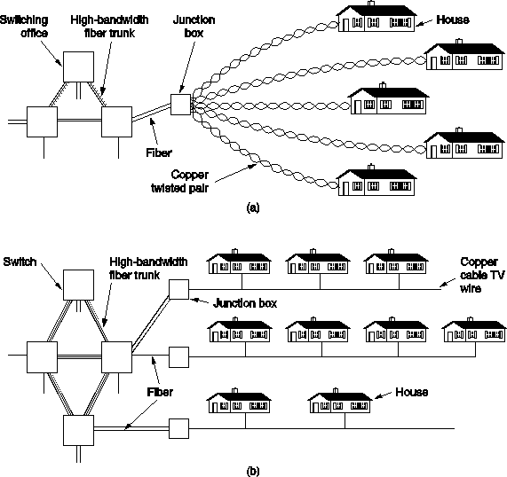 Fig. 2-23. Fiber to the curb. (a) Using the telephone network.
